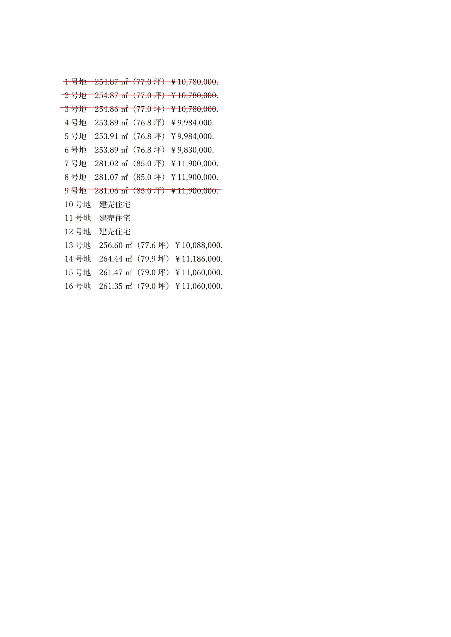 ※敷地内に電柱・支柱・支線を設置する場合があります ※土地契約後、三ヶ月以内に住宅建築工事請負契約締結、土地決済後、三ヶ月以内の棟上げを条件とします。 ※確定測量後、面積の変動に伴う価格の変動があります。 |